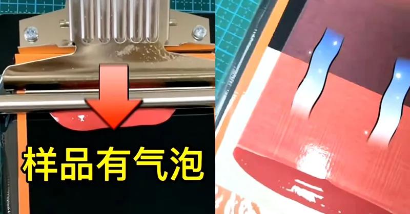 如果有一定粘度的產品有氣泡,那么干燥后是會出現坑洼的情況。同樣的,實驗涂膜中,在刮涂薄膜前要確保擠在底材上的樣品不能有氣泡,不然會出現凹點的現象,影響涂膜的整體的均勻性。